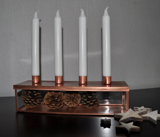 Låda med sidor av glas, och botten och lock i koppar. På locket är ljushållare för 4 stycken antikljus. Passar perfekt som adventsljusstake till jul. Glaslådan kan fyllas med fin dekorering efter årstid och säsong.
