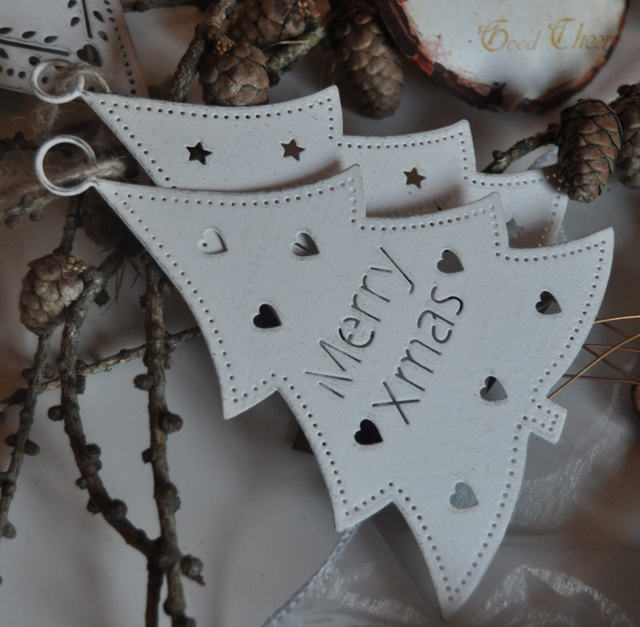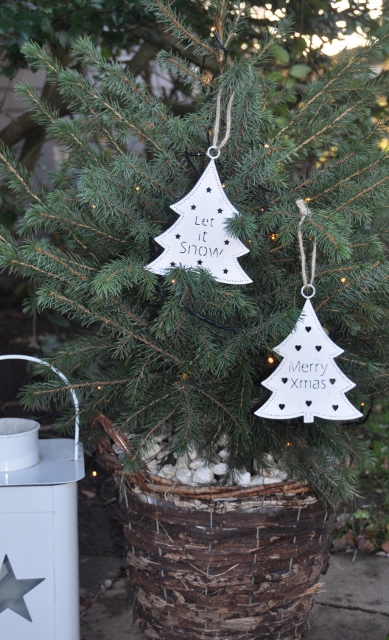 Vit julgran i tun plåt med text "Merry xmas" eller "Let it snow".